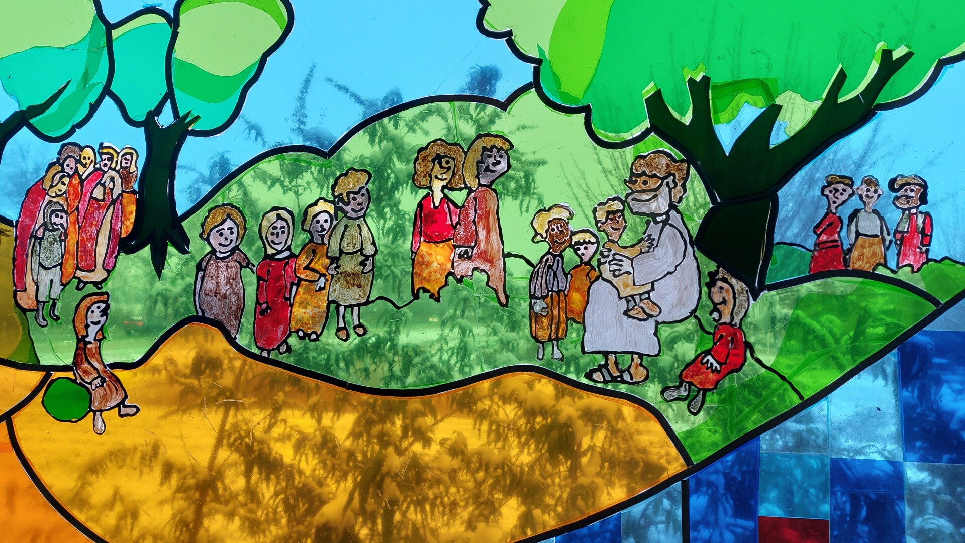 Kleurrijk raam. De protestantse gemeente heeft een tweede kleurrijk raam geïntroduceerd, met beelden van de ark en van Christus die de kinderen ontvangt. Klik hier.