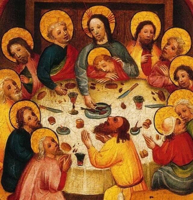 Heel opvallend op het schilderij is de ene persoon die geen nimbus om het hoofd heeft. Hij lijkt een ietwat afgezonderde plaats aan tafel te hebben. Ook zal het geen toeval zijn, dat zijn plaats recht tegenover Jezus is. Zo hoeven we er niet lang over na te denken wie dat is: Judas. Het lijkt alsof hij volop aan het woord is, terwijl hij tegelijkertijd met de handen gebaren maakt.