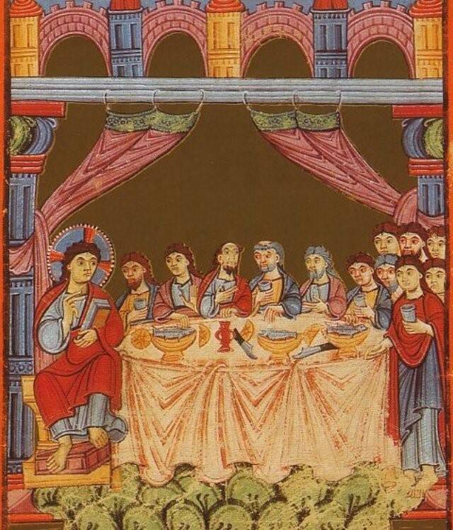 Op de afbeelding is, zo zien we aan de ogen, de aandacht van de leerlingen op Jezus gericht. Op tafel zien we een rode kan met twee oren (een amfora): die zal voor de wijn zijn. En we zien ronde broden: één hele en meerdere halve – die zijn al gebroken. Enkele leerlingen hebben een beker in de hand. Op de tafel staan ook drie schotels met vissen.