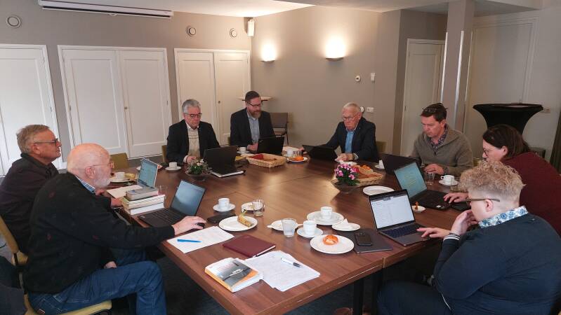 Foto: het breed moderamen bijeen, van links de tafel omgaand naar rechts: ds. Jan Dirk Wassenaar, Johan Kuiper, Jessica Braakman, Evelien Vrolijk, ds. Gijsbert Rohaan, Rikus Snel, ds. Wilbert Dekker en Wim Travaille; niet in beeld: Janny Bunschoten en ds. Klaas van der Kamp