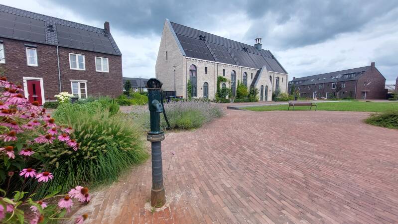 Foto: De kerk ligt aan een pleintje, waar ook een soort 'coöperatie' is gebouwd, een apotheek-look en iets van nostalgie is te vinden met een dorpspomp