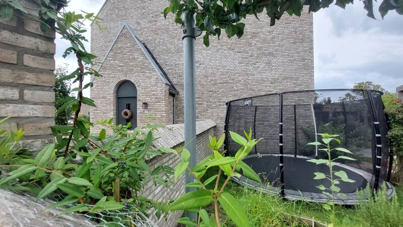 Foto: Aan de achterkant van de kerk zijn de tuintjes van de bewoners; vlakbij de entree hebben de bewoners er voor gekozen een trampoline aan te brengen