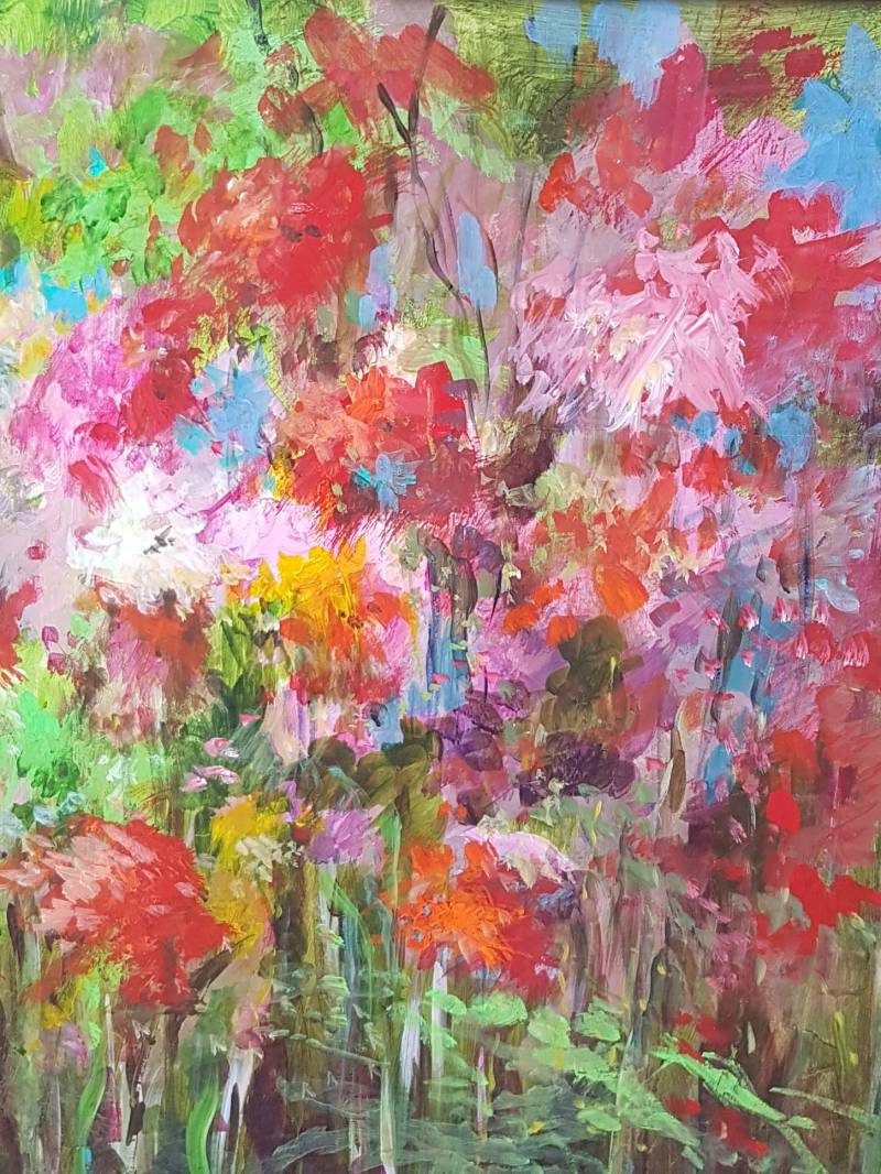 Foto boven: Fragment van het schilderij dat ik van de Raad van Kerken kreeg bij het afscheid; het is gemaakt door Anne van der Meiden, een man van wie ik veel boeken heb, van wie ik boeken kreeg, die ik navolg bij de diensten in de streektaal en die opvattingen heeft over massacommunicatie en marketing die me hebben gevormd. Veel had ik dus al van hem, maar nog geen schilderij. Dit doek is van 2012, als ik het wel heb. Anne heeft twee genres van schilderwerk: Twentse taferelen en stillevens met bloemen.