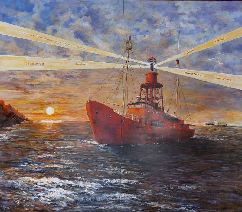 Op de eerste lichtbundel van het prachtig geschilderde lichtschip staat de tekst gebaseerd op Mattheüs 5: 16, met onze opdracht als christen in deze wereld. De overige bundels wijzen in verschillende richtingen: naar boven, naar binnen en naar buiten. Op deze lichtbundels staan onze kernwaarden. Dit zijn onze drijfveren, die laten zien waar wij voor staan.