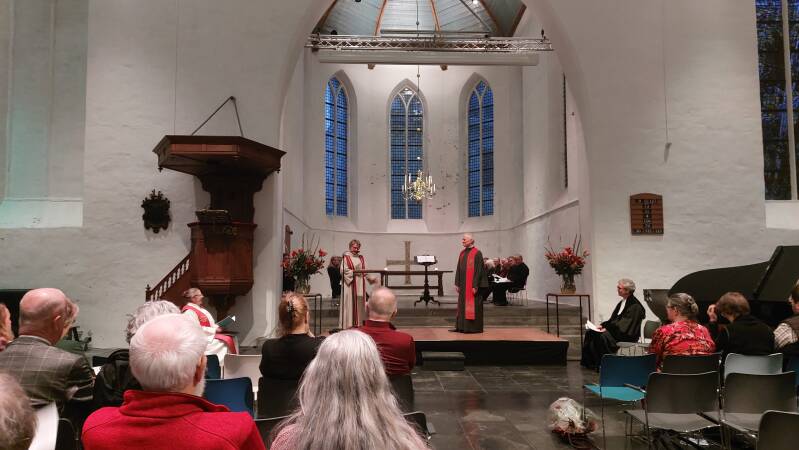 Foto: In de Geertekerk in Utrecht nam Sjaak Verwijs afscheid; ds. Trijnie Bouw, preses van de protestantse synode, sprak de woorden uit die in het dienstboek zijn opgenomen bij het afscheid van een dienaar des Woords