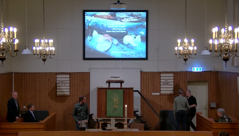 En natuurlijk in de verkondiging. Het gaat over Jakobus 4: 13-17. Over mensen die handeldrijven en geld verdienen. ‘U zou moeten zeggen: ‘Als de Heer het wil, zijn we dan in leven en zullen we dit of dat doen’. Over de letters ‘DV’ (Deo Volente, zo de Here wil en wij leven). Het heeft bij het eerste gehoor iets irritants, legde de dienaar van het Woord uit. ‘Alsof je klein wordt gehouden. Maar het heeft ook iets ontlastend. Juist in een wereld waarin zoveel druk op mensen wordt gelegd. Als je onder een open hemel leeft, kan dat rust geven. Dan leef je van de hoop.