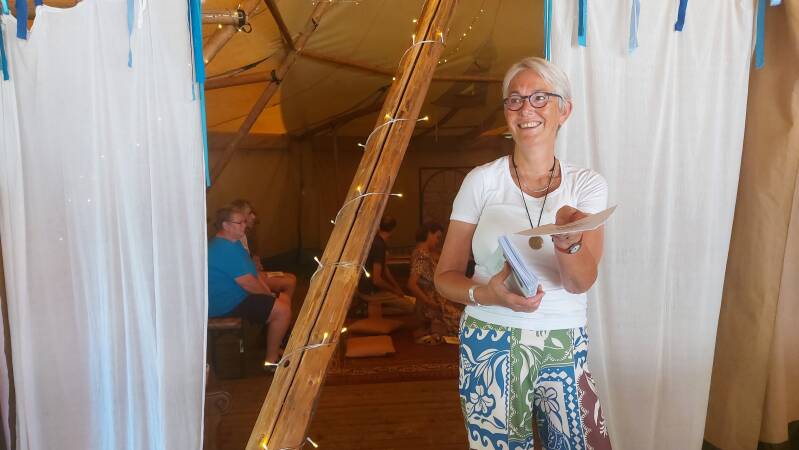 Ik zie dat om negen uur het eerste publieke moment wordt aangeboden. De gemeenschap van Nijkleaster verzorgt drie keer per dag een viering van een half uur in een van de Tipi-tenten van de Protestantse Kerk ingericht als kapel. Sietske Visser reikt me een liturgie aan en ik kan binnen kiezen uit de Taizékrukjes of de banken die in u-vorm om een liturgisch centrum zijn gezet. Hinne Wagenaar geeft om negen uur tekst en uitleg bij de symbolen, waaronder een verwijzing naar de familie Babayants, die in Kampen kerkasiel geniet. De hele tent vult zich, enkelingen komen iets later binnen. We volgen de lijn die ook in het Friese klooster wordt gevolgd, compleet met Friese teksten die kort worden toegelicht. 'Iepenje my foar jo goedens en reitsje my oan'.