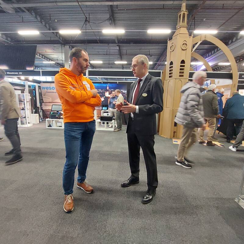 Foto: Met een koptelefoontechniek die beursdirecteur Marco van de Wetering uit Londen haalde is het mogelijk sprekers in de publieke ruimte van de beurs een presentatie te laten geven; als beursbezoeker ga je midden op de beurs gewoon onder het gehoor zitten met een koptelefoon op.