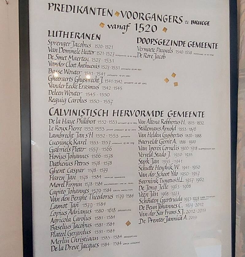 Foto: Het predikantenbord in de protestantse gemeente te Brugge, waarop de naam van ds. Frans van der Sar voorkomt