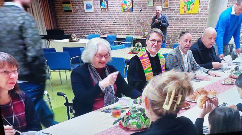 Niet eerder waren er zoveel cameraploegen en journalisten in Open Hof in Kampen als op 23 december 2024. Het was kort voor de kerst en ds. René de Reuver, scriba van de Protestantse Kerk in Nederland, toonde zijn betrokkenheid bij het kerkasiel in Kampen. Hij sprak met de familie Babayants, genoot de maaltijd met hen en ging voor in de liturgie. Cameraploegen van 6 in het Land, Op 1 en RTV-Oost registreerden het. En de schrijvende pers was onder meer aanwezig met het Nederlands Dagblad, de Stentor en de Volkskrant. Hier een paar beelden.