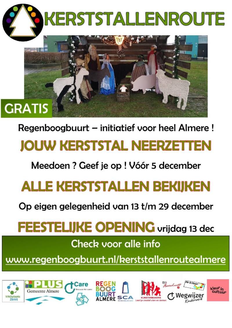 De kerststalroute in Almere wordt gehouden van vrijdag 12 december tot en met zaterdag 28 december. Er zijn diverse kerststallen te zien in de Regenboogbuurt (Prismastraat). De stallen dragen een eigen karakter; ze zijn zelf gemaakt, of bijgeschaafd of uitgebouwd. Ze hebben dit met elkaar gemeen dat ze vanaf de openbare weg te zien zijn. De route begint met een Lichtjestocht op 12 december. Het thema is dit jaar ‘Licht’. Dat maakt direct al duidelijk dat je de tocht vanaf schemer moet aandoen; zeg van 16 uur tot 21 uur.