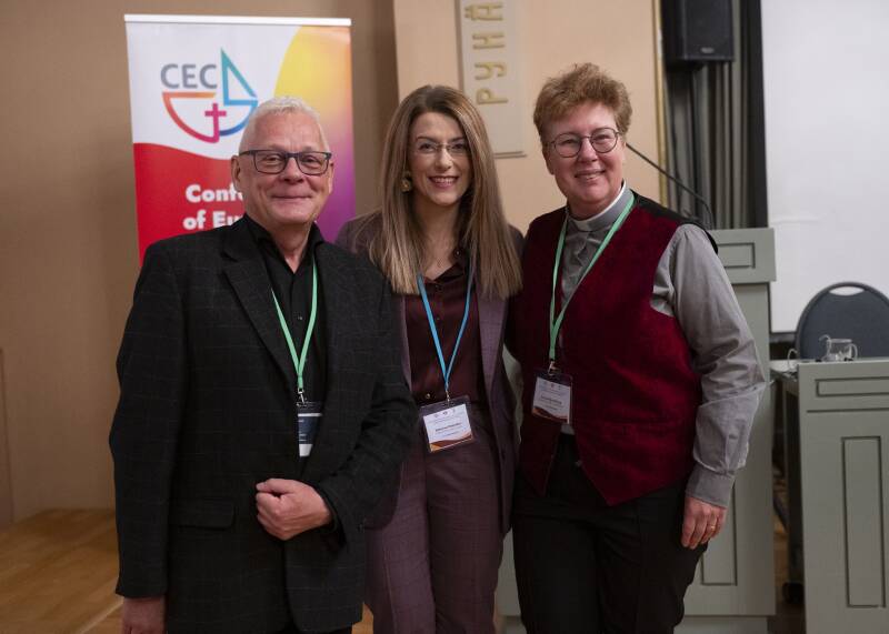 Foto: Mw. Katerina Pekridou: CEC programma medewerker voor theologie (in het midden), links Krzysztof Pikulski, priester van de Oud-Katholieke kerk van Polen, rechts de auteur van dit artikel: priester Erna Peijnenburg (foto: CEC/Kinga Majewska)