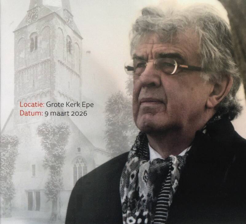 Foto's onder: Een goed gevulde Grote Kerk in Epe en een foto van Henk Vreekamp zoals hij op de uitnodiging stond
