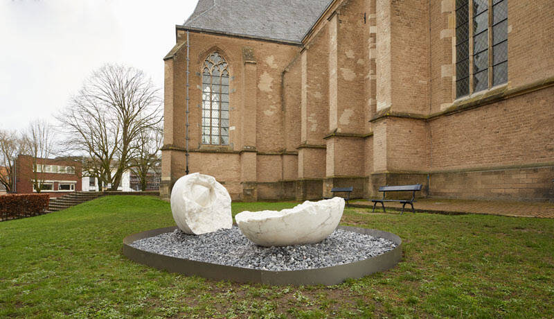 Foto: Ans Hey, sculptuur van albast, 1979, op de voormalige begraafplaats van de Bergkerk in Deventer (foto overgenomen van de organisatie)