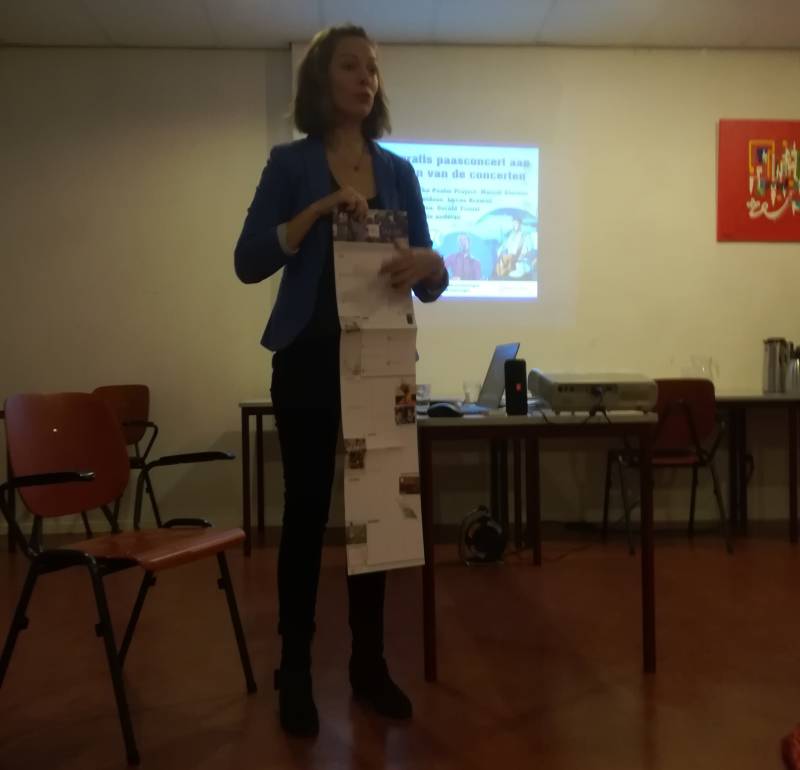 Foto onder: Gerdine Klein laat aan het eind een planningskalender zien, die van onder naar boven richting de paascyclus gaat.