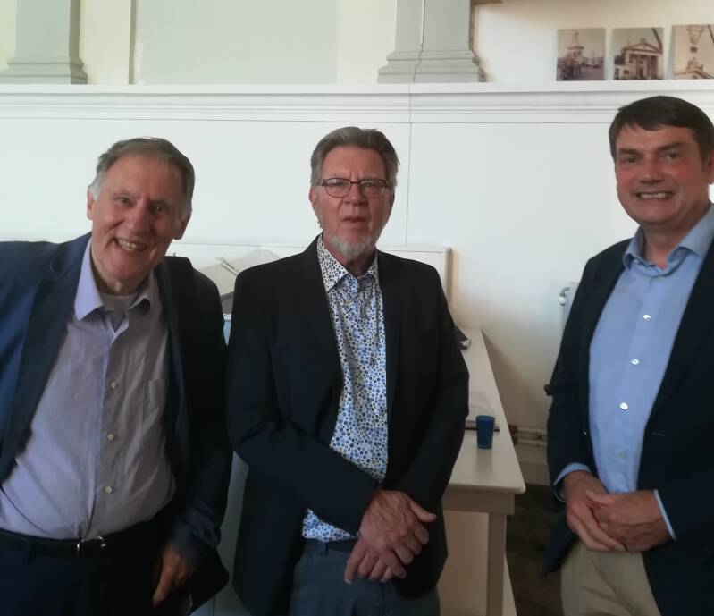 Eerste foto onder: Peter Siebesma geflankeerd door twee van zijn correctoren, links zijn oudere broer Reitze en rechts ds. Jan van Baardwijk (mensen in Tubbergen zullen hem herkennen, dat was zijn eerste gemeente, nu is hij verbonden aan de gemeente Amersfoort). In totaal waren er vier correctoren, ook Foekje Dijk (één van de inleiders bij de presentatie) en Bram Riepma hebben een bijdrage geleverd aan het correctiewerk.