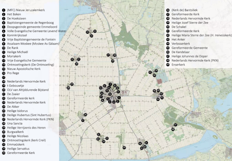 Kaart met een eerste inventarisatie van 49 kerken in de Noordoostpolder