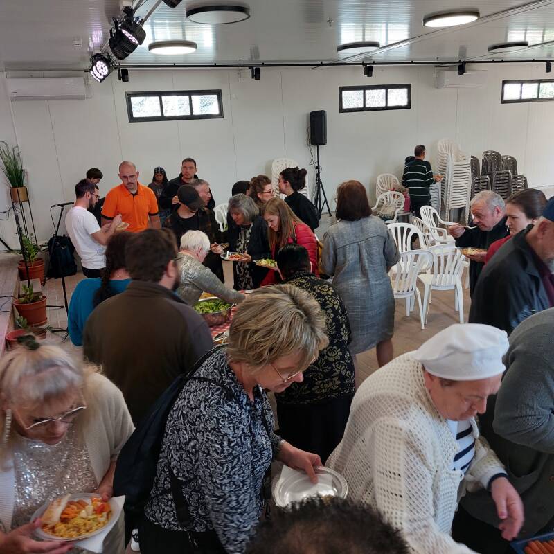 Foto: Na afloop van de dienst in Bersheba is er een gezamenlijke maaltijd, ieder heeft iets voor de maaltijd meegenomen