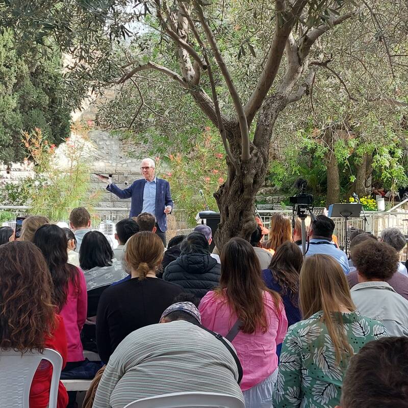 De reis viel samen met de verjaardag van mijn vrouw en van mij. De reis was een soort verjaardagscadeau. Op mijn verjaardag, 7 april 2023, waren we in Jeruzalem. Het was goede vrijdag. De beste manier om deze verjaardag te vieren leek me een kerkdienst bij te wonen in The Garden Tomb, de graftuin net buiten de oude stad bij de Damascuspoort. Die vrijdag was er om negen uur een speciale viering, waarin de eigen pastor Simon Holland voorging. De preek werd dit keer verzorgd door een speciale gast ds. Nicky Gumbel, de man die de Alfacursus heeft ontwikkeld en nu sinds zijn pensionering de hele wereld over zwerft en de Alfacursus verder in de vitrine zet. Hij was met een hele groep in het heilige land gekomen.