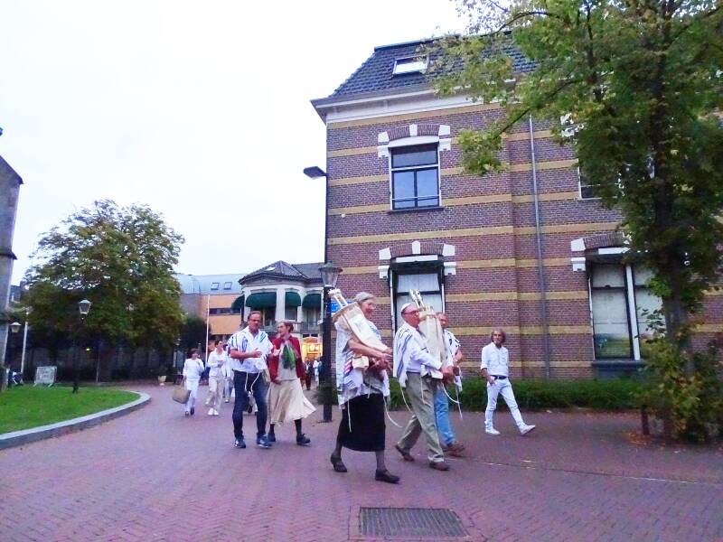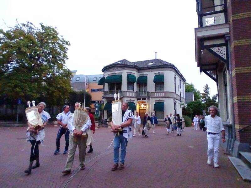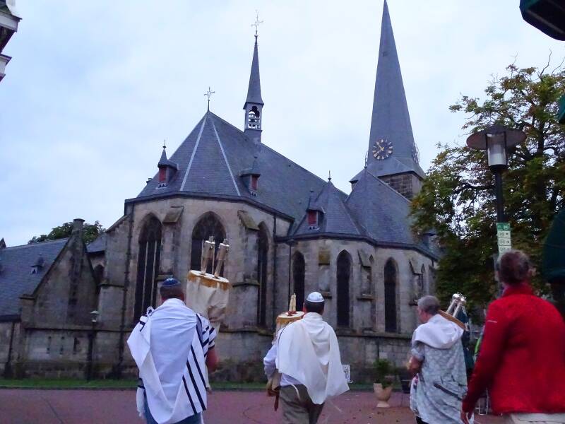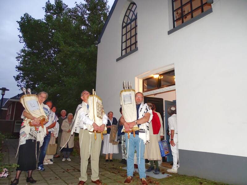 Het overbrengen van de sefers (boekrollen) vond plaats in een soort van processie, langs de katholieke Pancratiuskerk naar de voormalige hervormde kerk aan de Jonkheer von Heijdenstraat. Bert Oude-Engberink kijkt er met dankbaarheid op terug: ‘De kosters hadden de kerkzaal zelfs helemaal voor ons aangepast, zodat we ons op het oosten konden richten. We zijn er heel blij mee geweest’.
