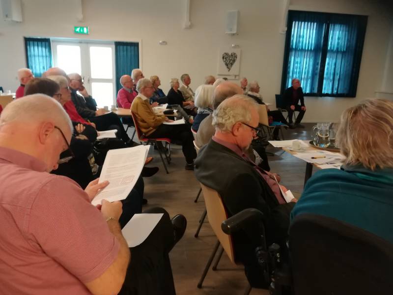 Foto hieronder: Meer dan vijftig mensen met wie Gé nu of eerder samenwerkte, waren naar Hellendoorn gekomen om de scheidende secretaris de hand te drukken.