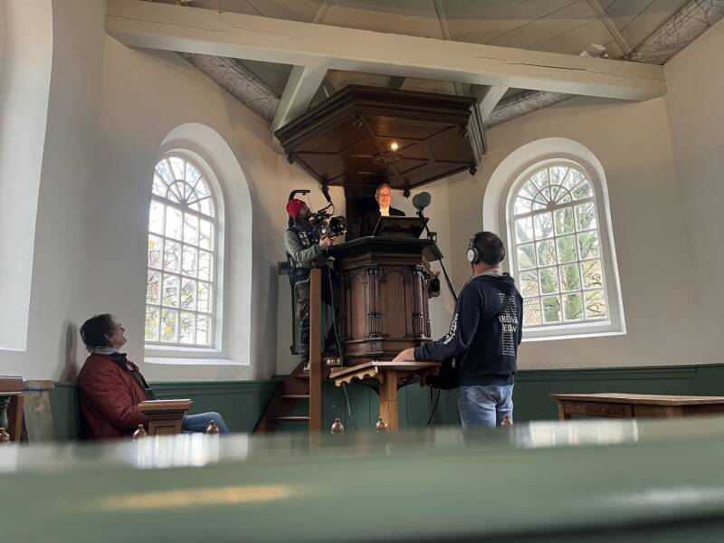 Foto: Ds. Jan Dirk Wassenaar die als predikant een bijdrage levert aan een film over de watersnood van 1825 in de kerk van Sandfirden. Hij had er een speciaal tenue voor bij elkaar gezocht om historisch verantwoord in beeld te komen.