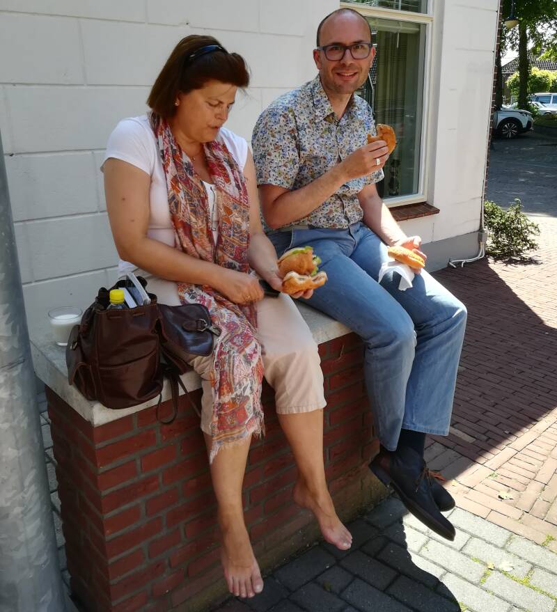 Het begon met een broodje. Voor sommige collegae tijd om nog even buiten wat frisse lucht mee te nemen; links Hélène Evers (Zwolle), rechts Jonathan Zondag (Dedemsvaart).